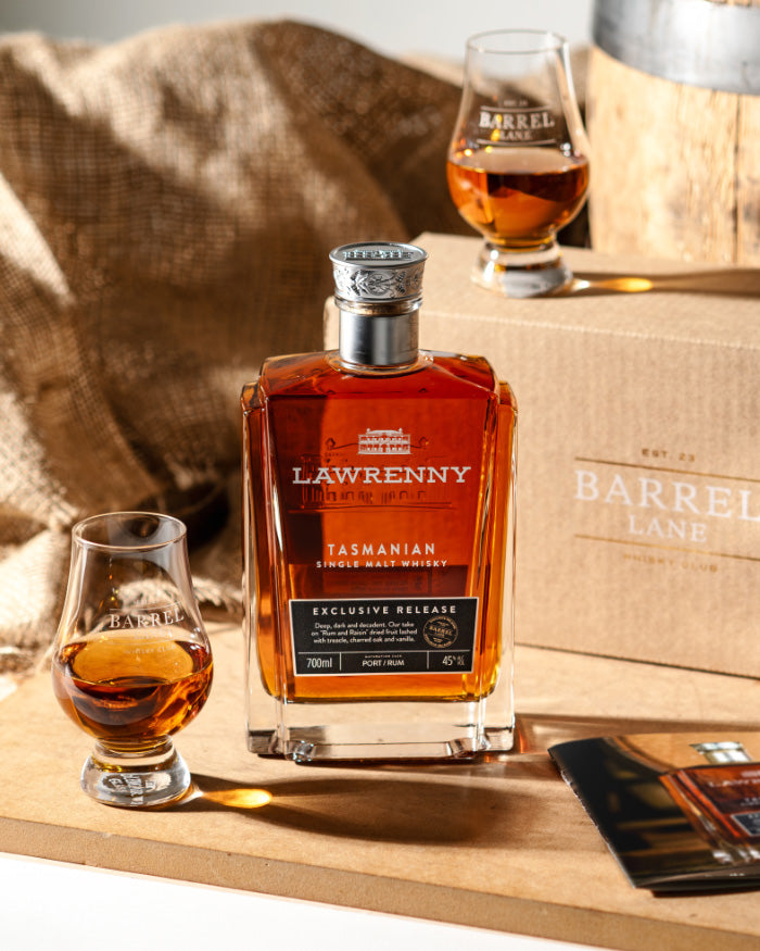 A bold new direction from one of Tasmania’s few true paddock-to-bottle distilleries. Matured for six years in vibrant port casks, then finished in rare rum barrels that once held bourbon and stout, this exclusive release is lush with black cherry, honeyed stone fruit and toasted spice, finishing long with golden syrup and coconut. Crafted for Barrel Lane members only.